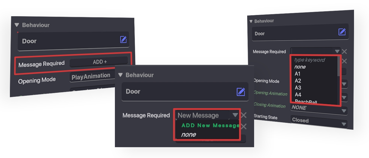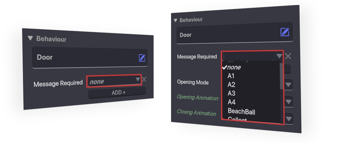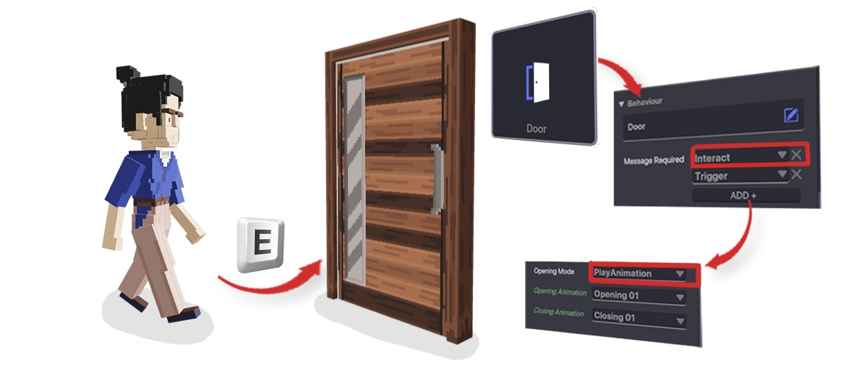 例えばDoor のビヘイビアを使って体験内にインタラクティブなドアの機能を設定することができます。「E」キーを押すとアバターは関連するオブジェクトのアクションをトリガーし、Interact のメッセージを送信し、Door のビヘイビア のパラメーターがMessage Required として受信し、ドアが開くというアニメーションへと繋げることができます。