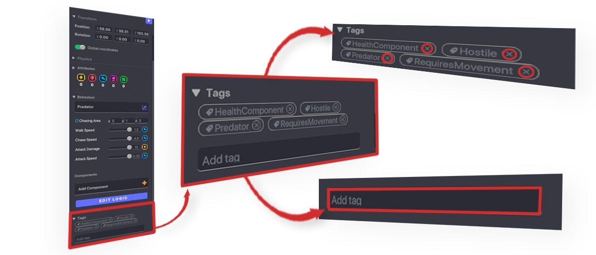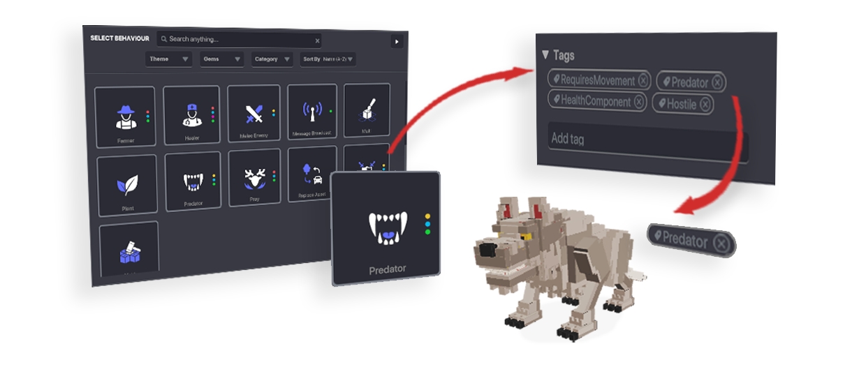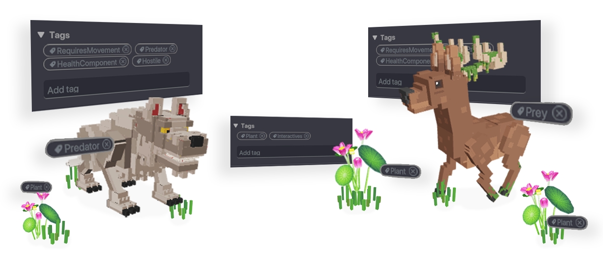 例:Predator のビヘイビアを追加することで RequiresMovement、Predator、Health のコンポーネント、Hostile のタグが適用されます。Prey のビヘイビアの場合は RequiresMovement、Prey、Health のコンポーネントのタグが適用されます。