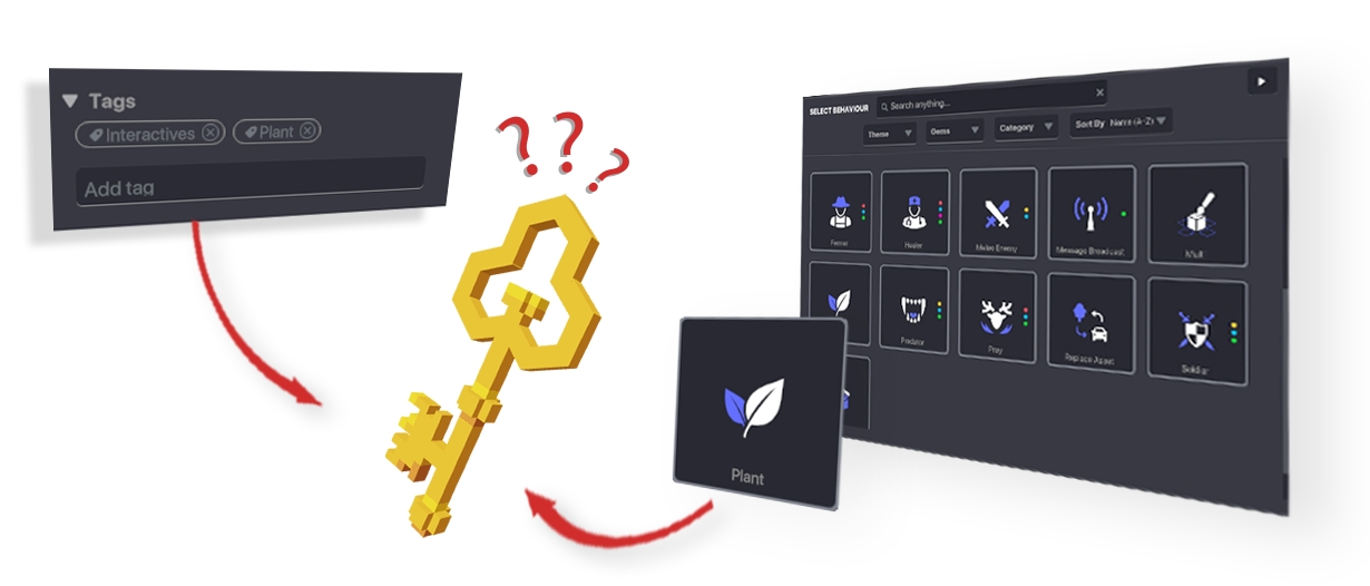 ビヘイビアをオブジェクトに追加することですべてのタグと様々な数値が割り当てられ、それによってオブジェクトは体験内で一種のエンティティとして識別可能なものになります。