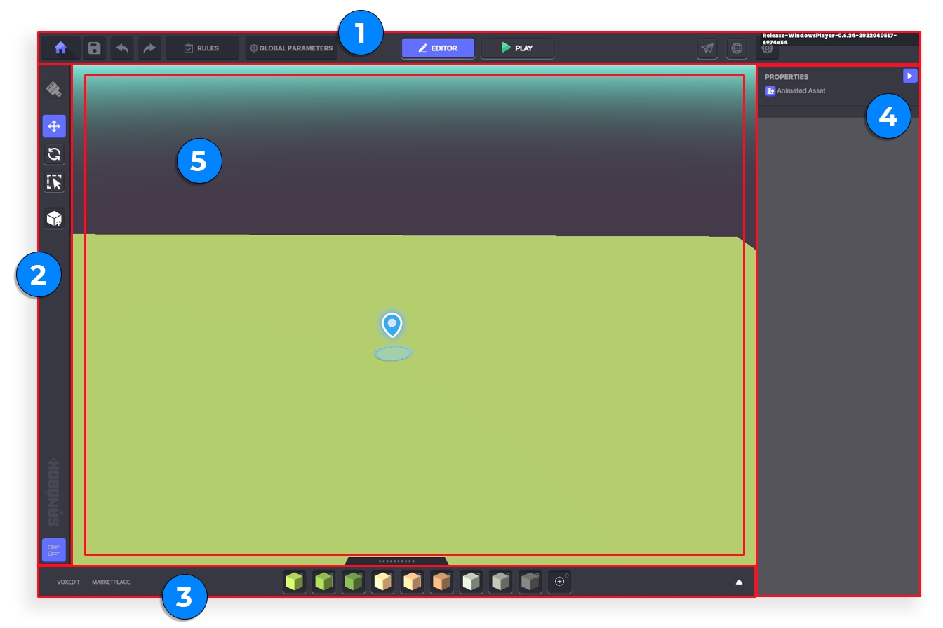 インターフェースは5つの大きなセクションに分かれています。それぞれにオプションや機能があり、作業によって使い分けることができます。
