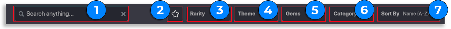 以下のような特定の情報を使用して絞り込み検索をすることもできます。 Favorite(お気に入り) Rarity(レア度) Theme(テーマ) Gems(ジェム) Category(カテゴリー) Name(名前)