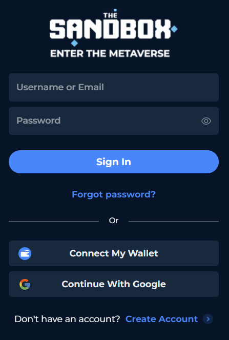 You will log in to The Sandbox website to access your account. Your username or email address and password are also used to log in to VoxEdit, Game Maker, and the metaverse Game Client.