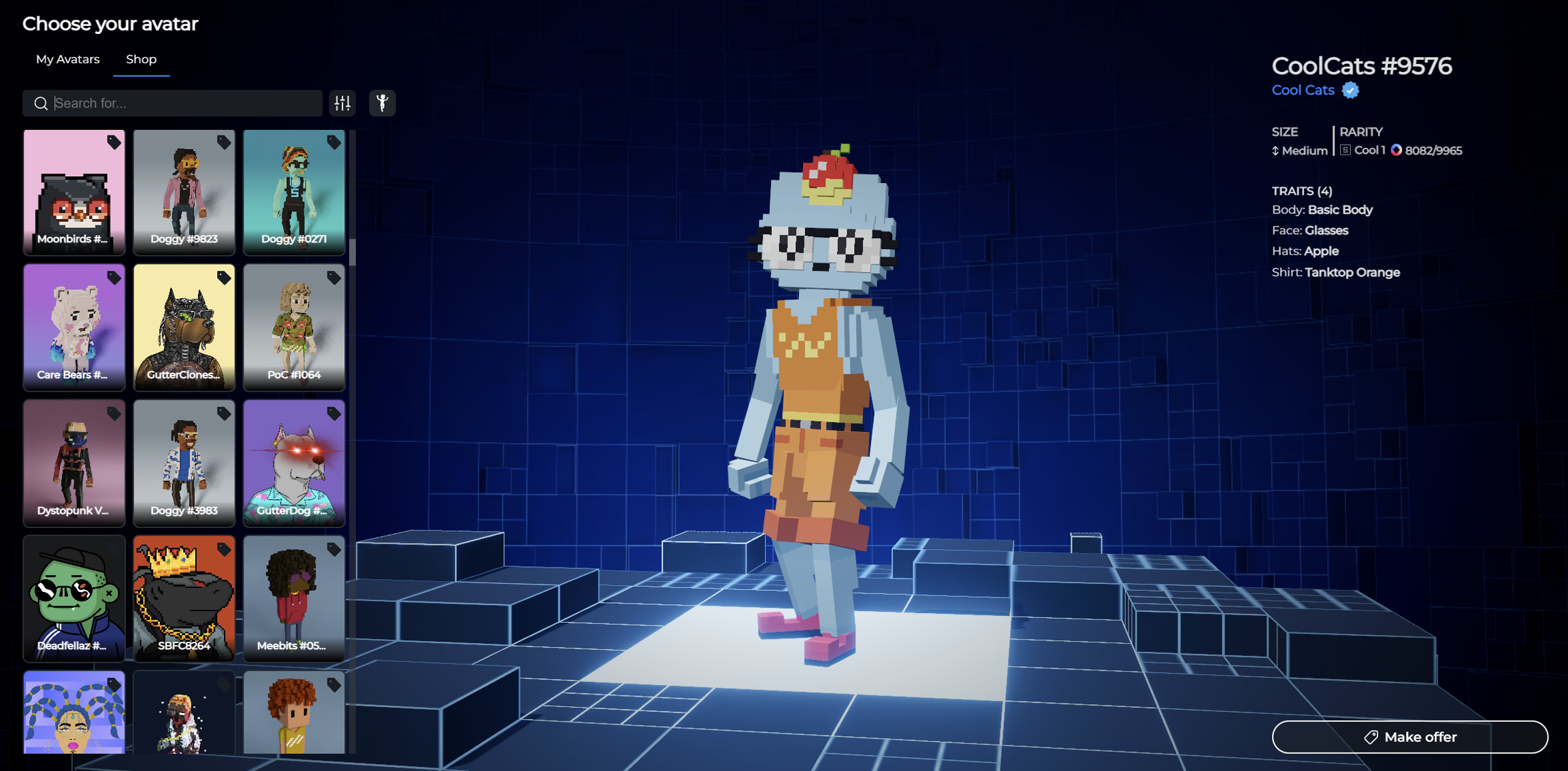 The Shop tab is a great way to preview avatars, especially ones from external NFT collections. Hover over an avatar to see