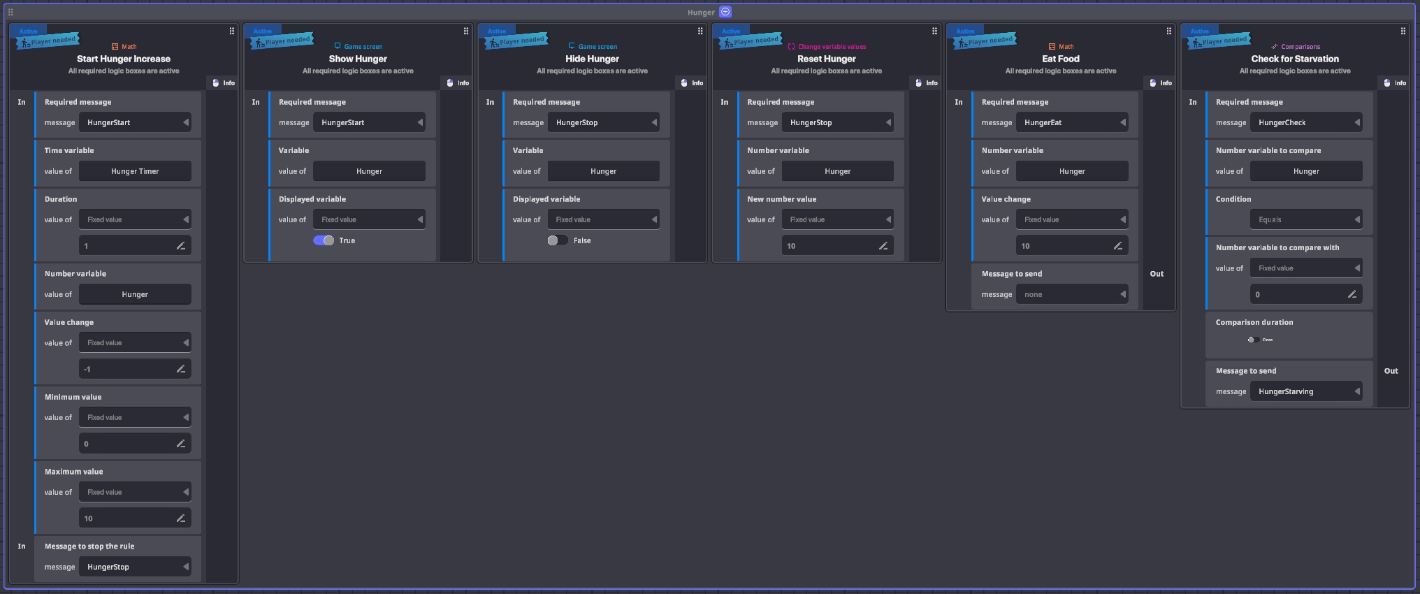 Hunger introduces a new player stat, that is useful for survival games. The stat will continously decrease and can be increased by performing interactions, like collecting an item.