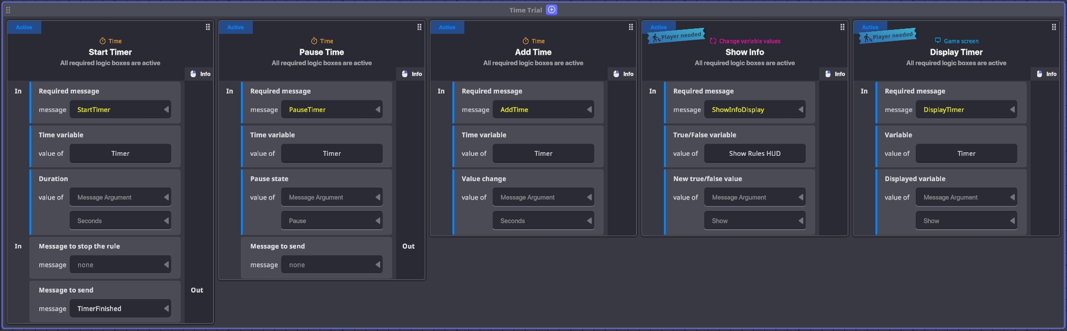 A Time Trial allows creators to define a timer that can be paused and modified by adding or removing time. After the timer has run out it will send a message.
