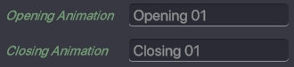 Opening Animation - メッセージを使い、ドアが開くことがトリガーされた時に表示したいアセットのアニメーションを選択できます。 Closing Animation - メッセージを使い、ドアが閉じることがトリガーされた時に表示したいアセットのアニメーションを選択できます。