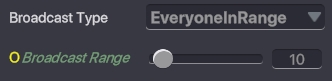 EveryoneInRange - レンジ内のすべてのオブジェクトにメッセージを送信できます。 Broadcast Range - メッセージを送信する範囲を設定できます。 このパラメーターは黄色の丸のギズモで表示され、スライダーを使うか数値を入力して調節できます。