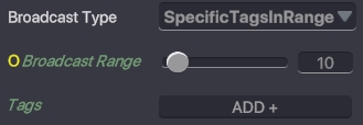 Broadcast Range - メッセージを送信する範囲を設定できます。 このパラメーターは黄色の丸のギズモで表示され、スライダーを使うか数値を入力して調節できます。 Tags - メッセージの送信先のタグを追加したり削除できます。