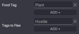Food Tag - オブジェクトが食べ物を探す際に使用するタグです。1 つ以上のタグを追加したり、必要ないタグを削除できます。 Tags to Flee - タグがEnemy Detection Range に入ってきた場合にオブジェクトが逃げるタグを設定できます。