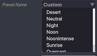 Preset Name - ドロップダウンメニューから天気を設定するプリセットを選択できます。固有の天気のプリセットを作成するにはCustom を選択してください。