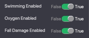 Behaviour のタブのコントロールリストを下へスクロールしていくと左側にSwimming(泳ぐ)、Oxygen(酸素)、Fall Damage(落下ダメージ)のトグルが表示されます。このトグルを使って体験にあったコントロールを設定します。プレイ中にこの設定を変更することはできません。