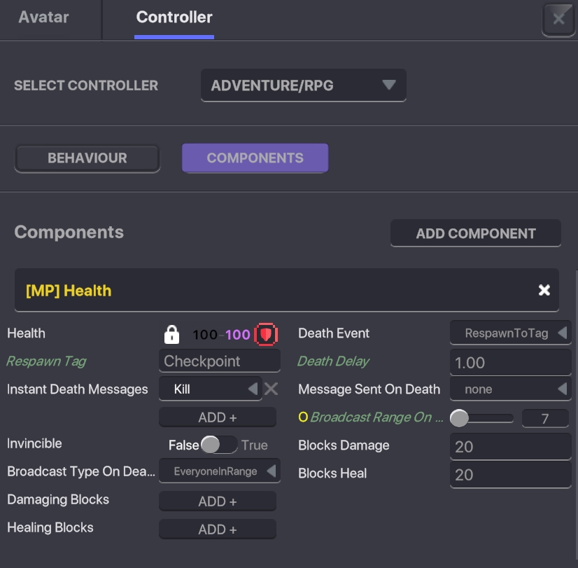 アバターのHealth のコンポーネントの変更方法と削除方法を解説します。アバターのステータスに基づいてゲームプレイをカスタマイズできます。