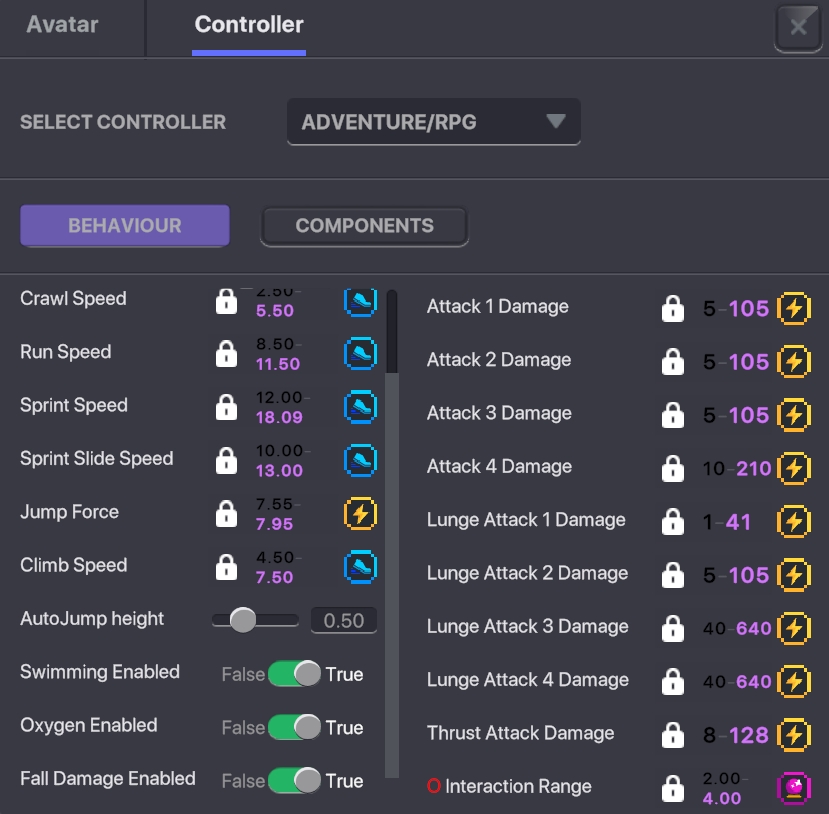 アバターのビヘイビアやコンポーネントを変更したり、コントローラーのタイプを選択するオプションがあります。