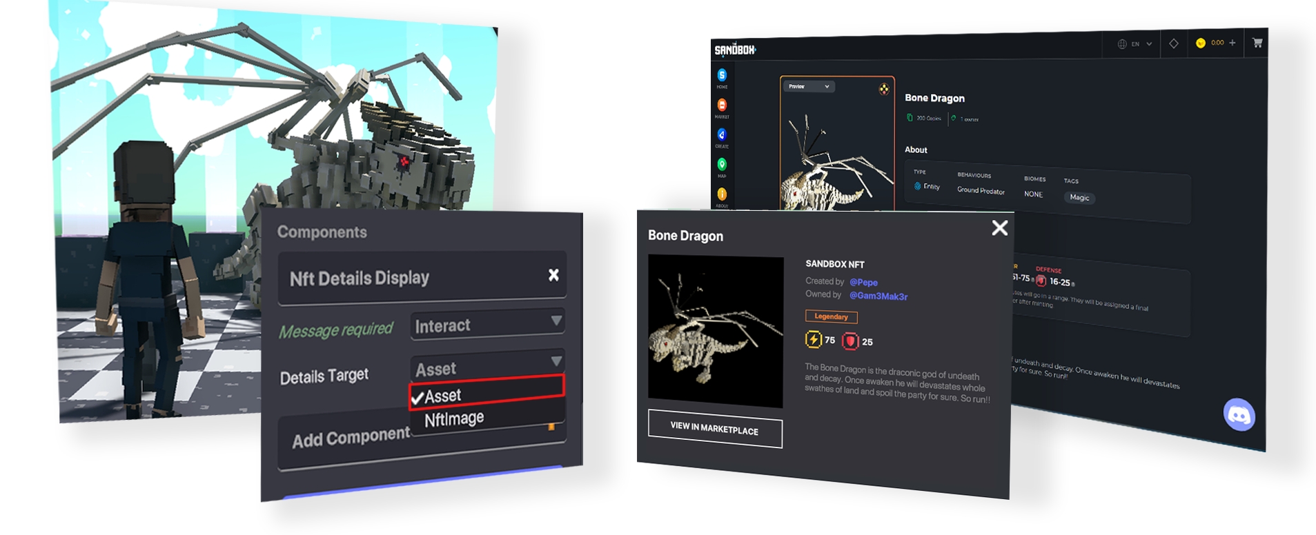 Details Target - NFT の情報を選択します。 Asset - 体験内でアセットの情報を表示し、The Sandbox のマーケットプレイスに誘導できます。 NFT Image - フレームにディスプレイされているNFT の詳細を表示し、OpenSea に誘導できます。