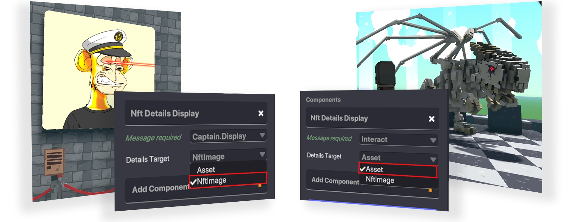 NFT Details Display はアセットの詳細をディスプレイしたり、NFT Image Display のコンポーネントを使用しているオブジェクトにも適用することができます。遊びに来た人にディスプレイしてあるものに関する以下の情報を直接または間接的にポップアップウィンドウを通じて見てもらうことができる機能です。