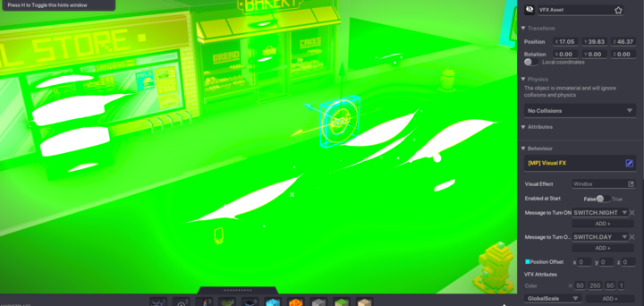 Visual FX のビヘイビアはオブジェクトやオブジェクトの周りに設定でき、ビジュアルアンビエンスやフィードバックを表現できます。またCrowd Event のビヘイビアを使ってアバターに設定することもできます。