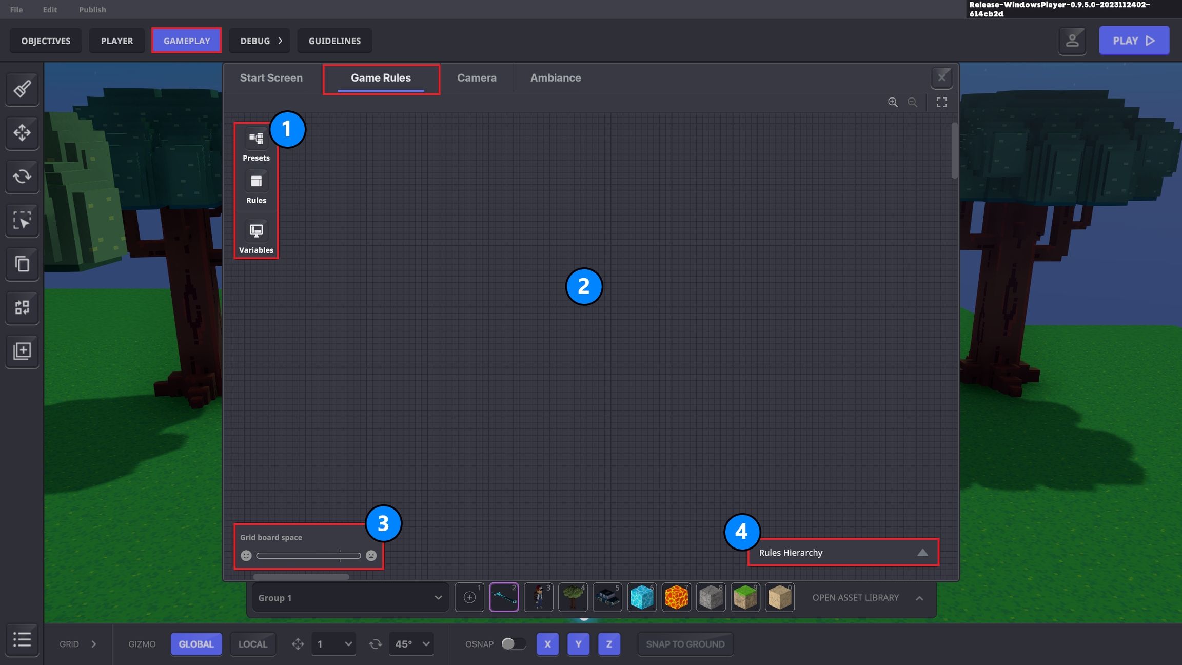 1️⃣ 左側に表示されるアイランドメニューにはPresets(プリセット)、Rules(ルール)、Variables(変数値)などのメカニクスを作る機能があります。