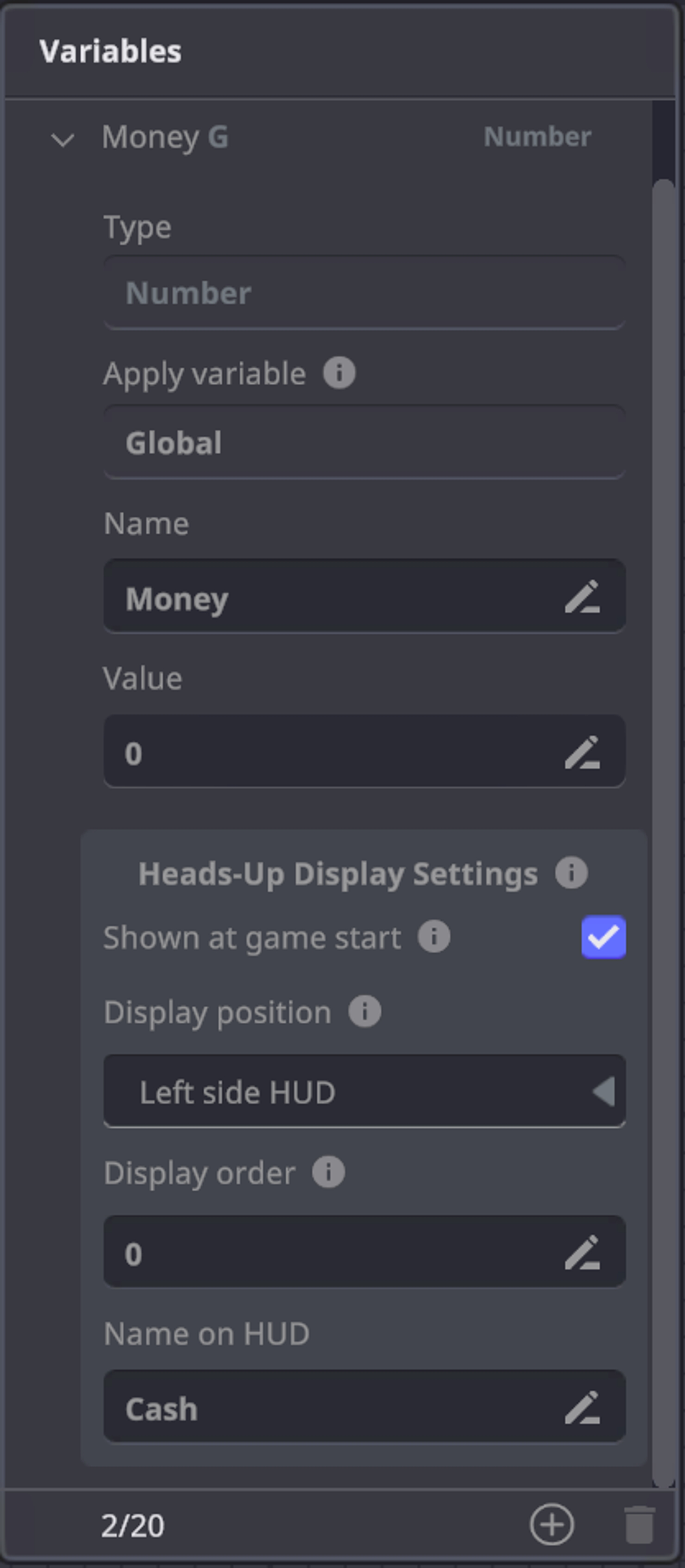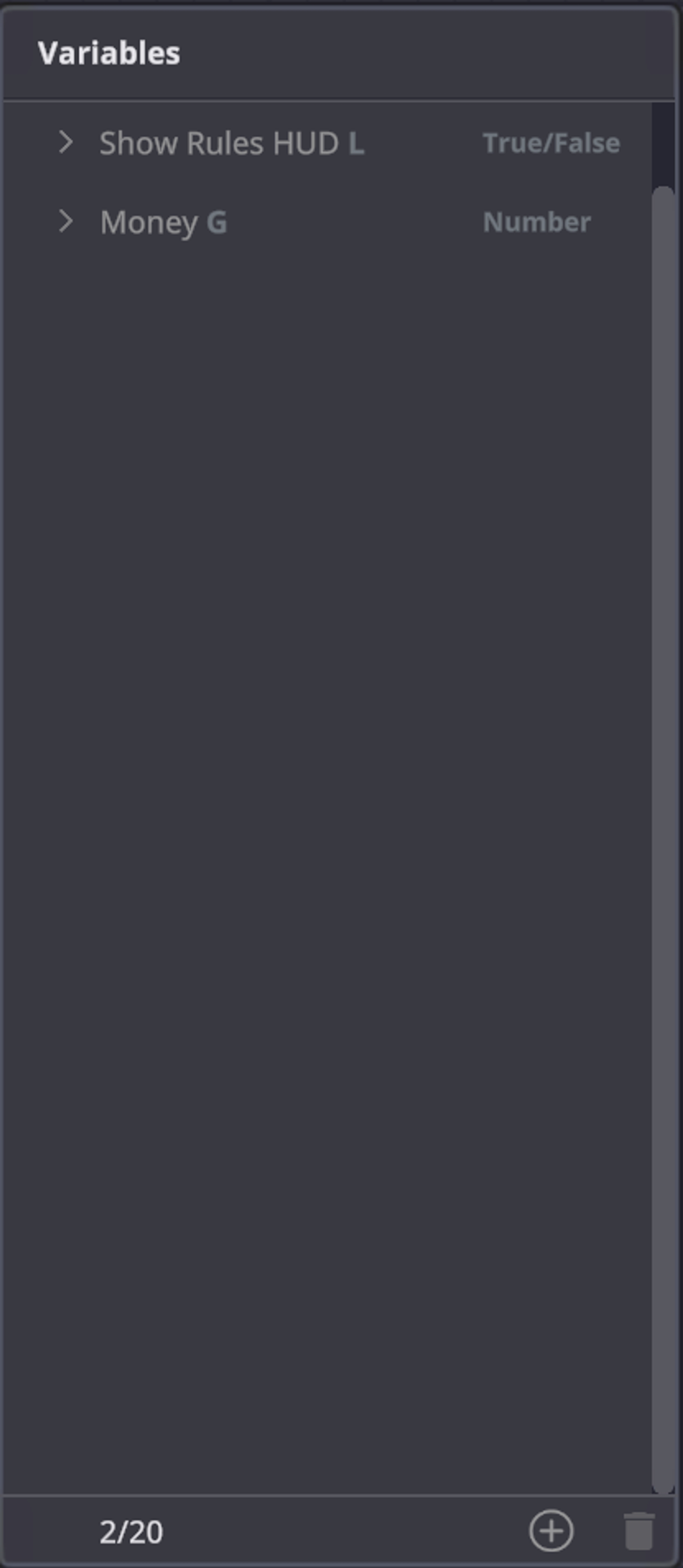ここでは新たな変数値を追加することができ、既存の変数値を削除したり編集することもできます。リストには変数値の名前、グローバル変数値かローカル変数値か、種類(数字、時間、True/False、テキスト)が表示されます。変数値のリスト名は設定内使用されますが、変数値の設定のName の欄に入力する名前はプレイヤーのHUD(ヘッドアップディスプレイ)に表示されます。