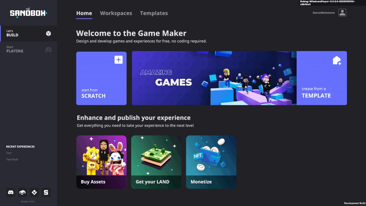 🆕 Home(ホーム画面) - 新しい体験の制作、テンプレートの使用、アセットやLAND の購入、収益化のためのThe Sandbox のエコシステムへのアクセスができます。