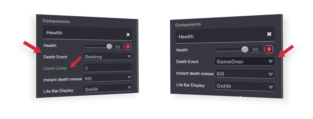 Health のコンポーネント Death Event がDestroy に設定されている場合:緑の斜字体のDeath Delay は真下に表示され、カスタマイズできます。 Death Event がGameOver に設定されている場合:Death Delay は表示されず、使用できません。