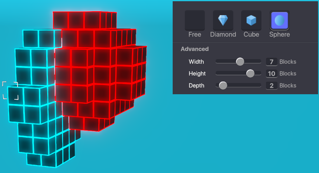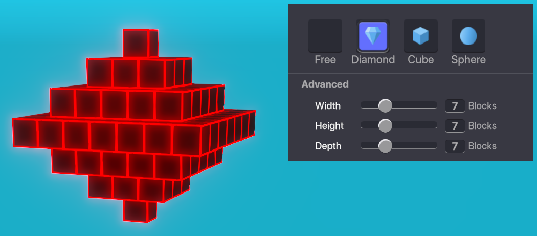 プレイヤーが一つづつ拾ったり破壊したりできる「ブロック」を使ったゲームを制作するには32x32x32 のボクセルアセットを制作してください。そのボクセルアセットを透明度の無い固形のブロックとして使用できます。