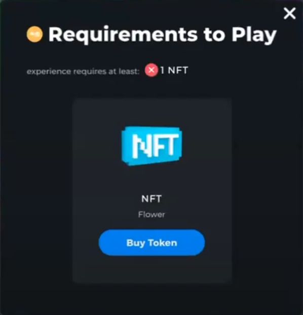 If an NFT Requirement is set, the Experience Page will show a See Requirements button instead of a Play button, which will open a window to give players more information and direct links to purchase the required tokens to enter.