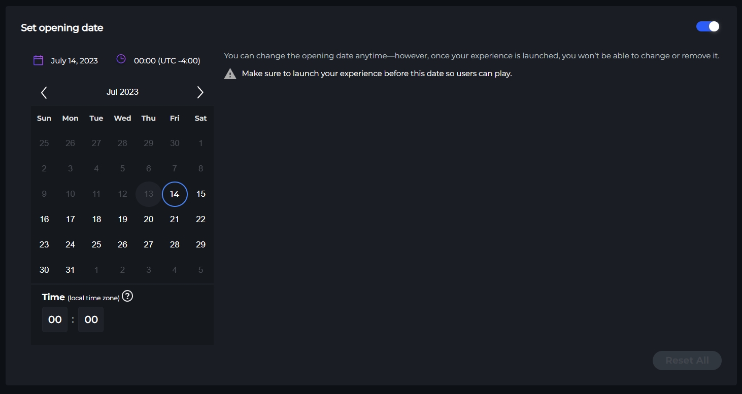 In this section, you can set the opening date for your Experience to be playable. This can be set in the future, which automatically activates the Play button on your Experience Page.