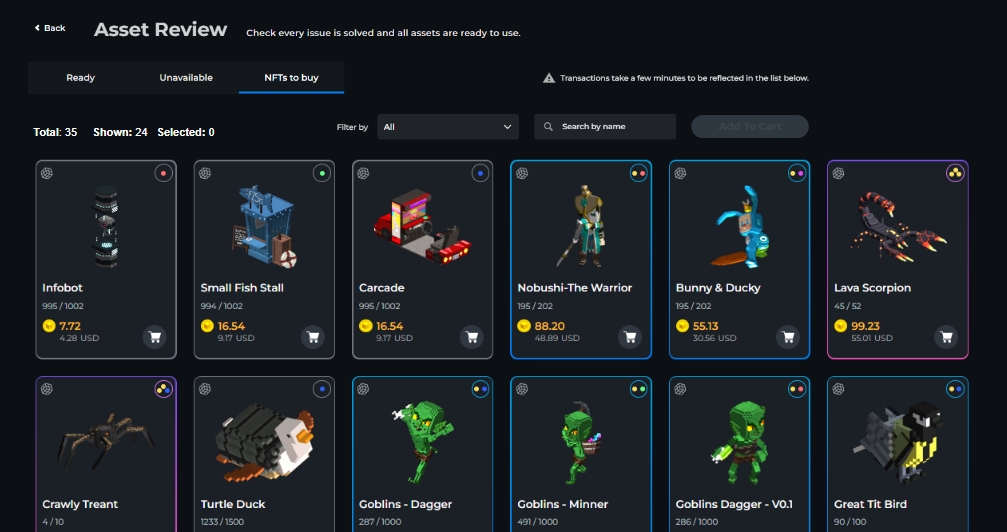 Since you must own all assets used in your Experience in order to launch it when the feature is available, this tool will automatically review and alert you to any assets that are not owned in the wallet connected to your account at The Sandbox. Any assets that are not marked as Ready can either be purchased by adding them to your shopping cart here, or you can edit your Experience in Game Maker and replace them with other assets you own.