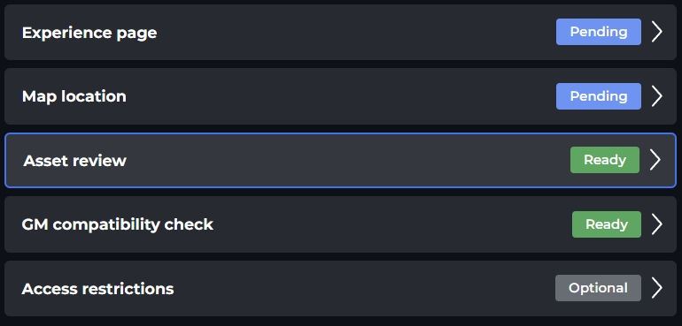 Once the Unavailable or NFTs to Buy categories are empty, you've passed the Asset Review stage! Keep in mind that if you change the assets used in your Experience in Game Maker, you will need to do another Asset Review.