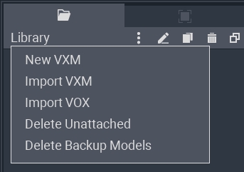 You can click the three dots button to open a main menu to create a new VXM, import a VXM, import a VOX, delete all models that are not linked to the nodes in the Skeleton Panel, and delete backup models.