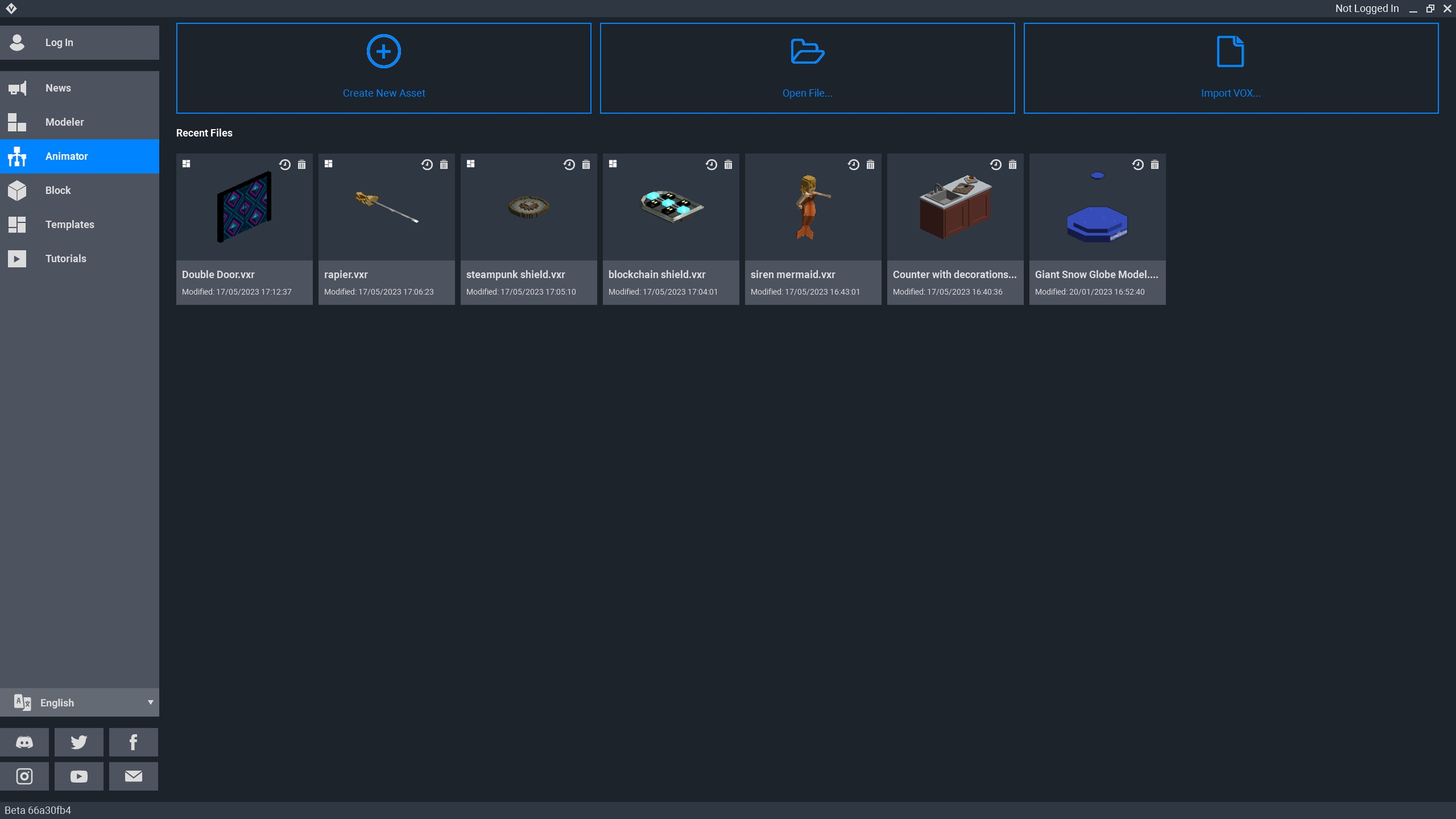 In VoxEdit's Home screen, select the Animator in the left menu to begin a new project. You can create a new asset, open one from your files, import a file in VOX format, or access recent files by selecting a thumbnail.
