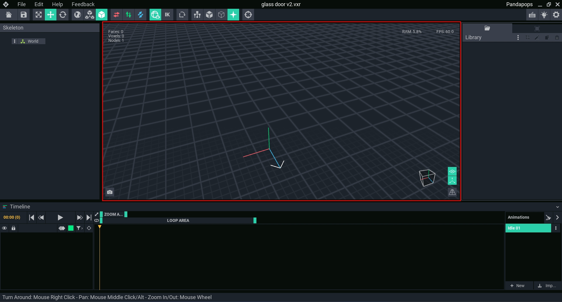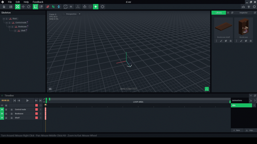 The Skeleton Panel displays the structure of your compound or animated asset's rig, while the viewport displays models linked to each part of the rig, called a node, and allows you to change the position and rotation of each model/node to pose your rig and create motion keyframes in animations.