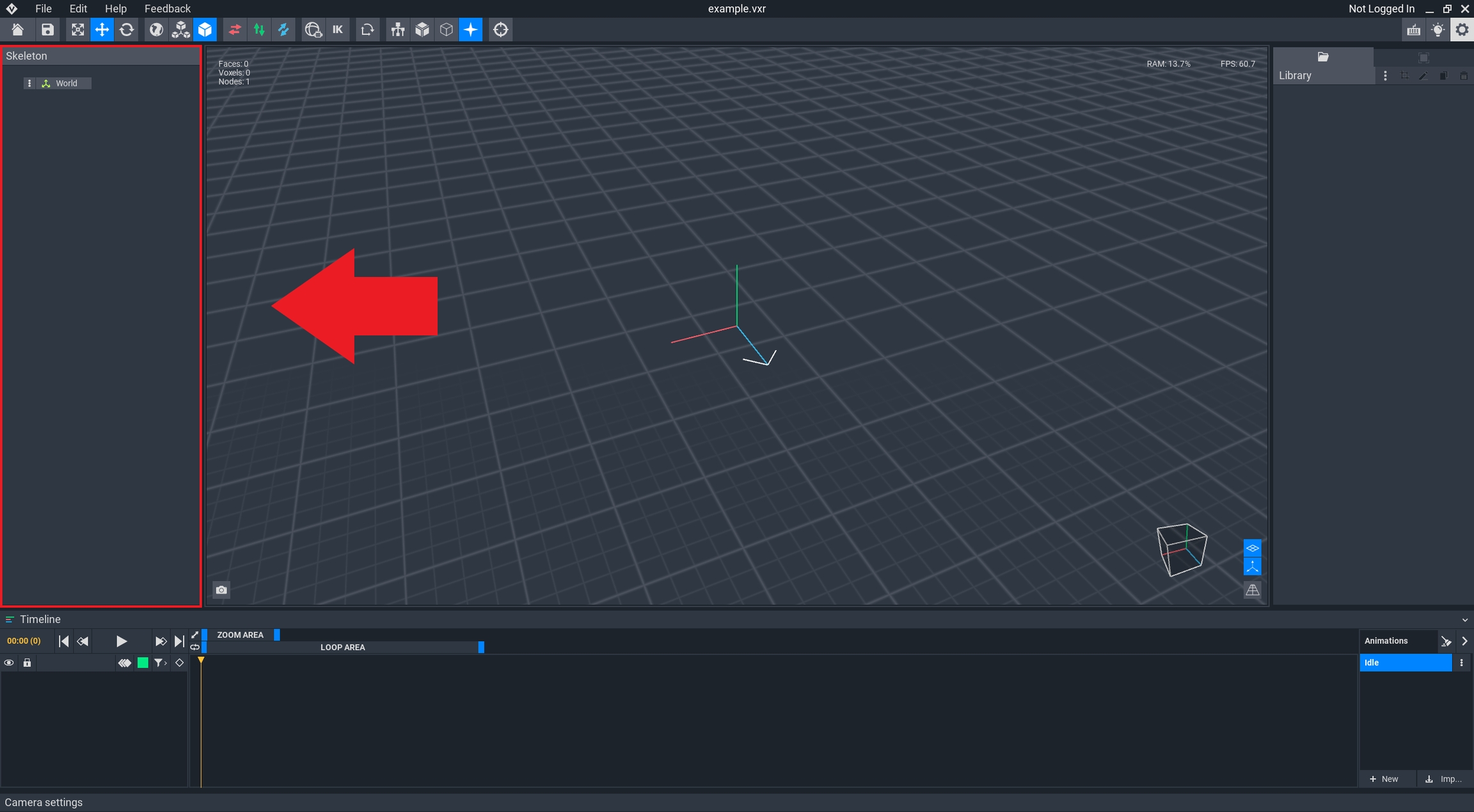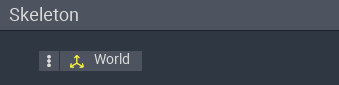 The Skeleton Panel for a new project includes a root node named 'World'.