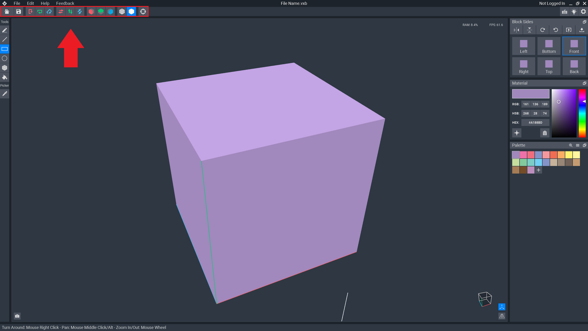 Toggle on and off a line of symmetry on the X axis for mirrored editing of the left and right faces of the Block.