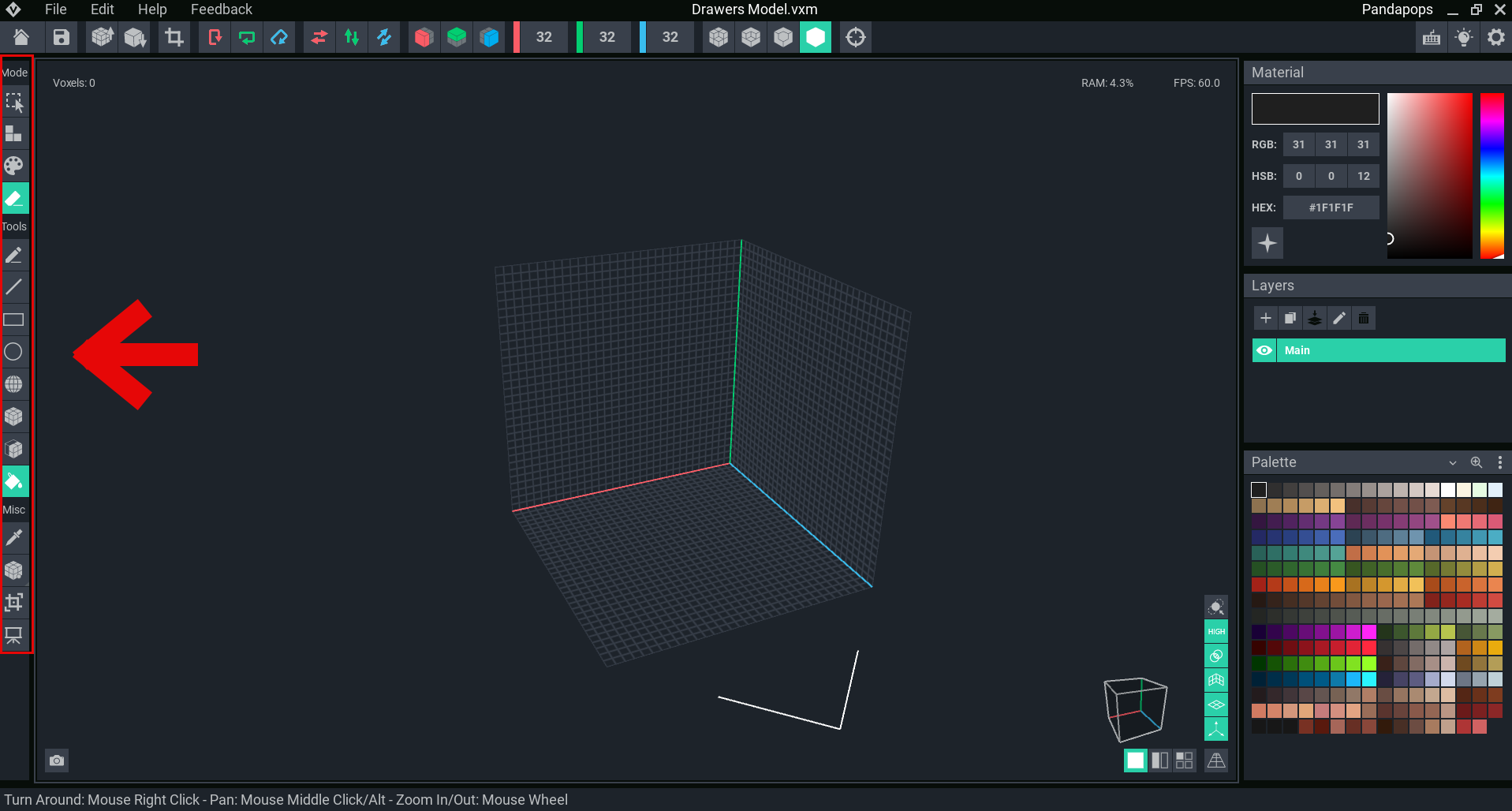 A Mode is used in combination with a Tool shape in this toolbar, providing a variety of ways to create and modify your project.