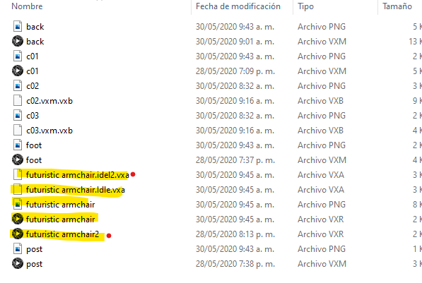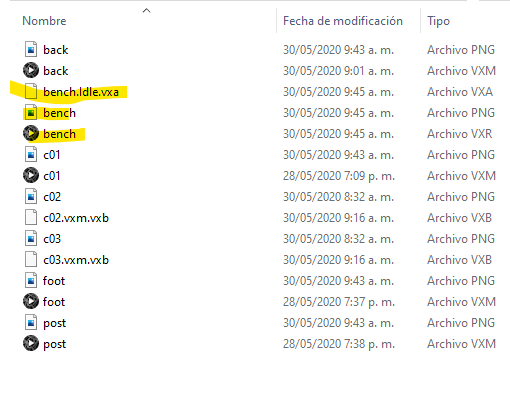 Each asset has to be in a specific folder. Extra files may cause conflicts. In this folder, you should have only .vxr / .vxm / .vxa / .vxb & .png files.