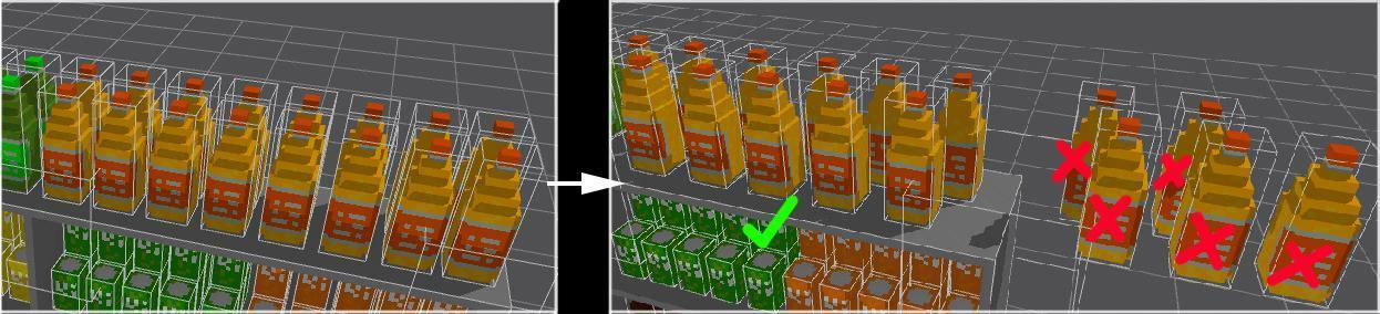 The items on the shelves align on the same 3D grid, so it's easy to include many items in each large model (collision volumes highlighted in green). This is much more efficient than making each item a model linked to its own node.