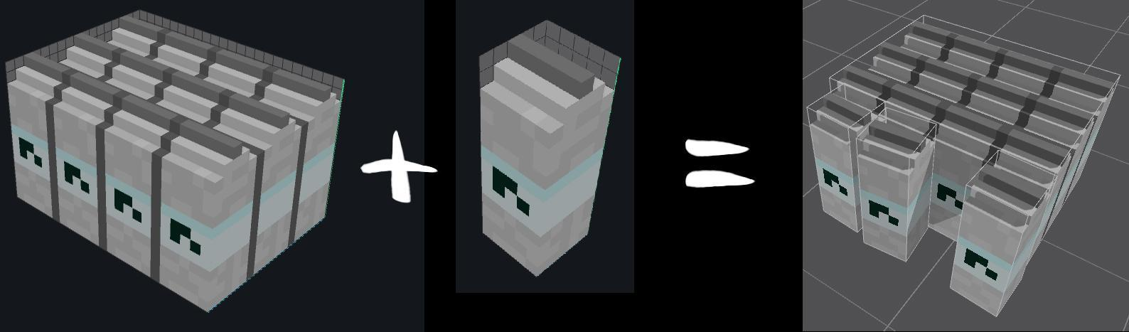 The image on the right groups 12 milk cartons into 1 model to reduce node count and fills the space between milk cartons with a darker shadow colour to reduce face count. This is a huge improvement in performance, but it looks too simple on its own.