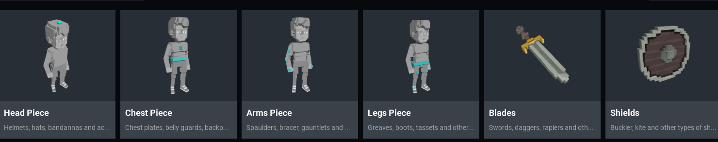 Equipment templates are required to create a special asset class of items players can apply to their Avatars. The game engine will not recognise an asset as equipment unless it is made from one of the following templates: head piece, chest piece, arms piece, legs piece, blades, shields.