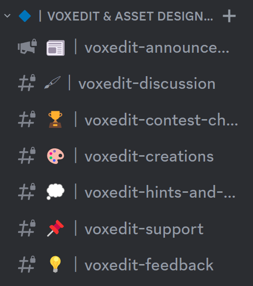 For example, if you wish to discuss things related to VoxEdit, or get support with the VoxEdit software, you can find these under the VoxEdit category.