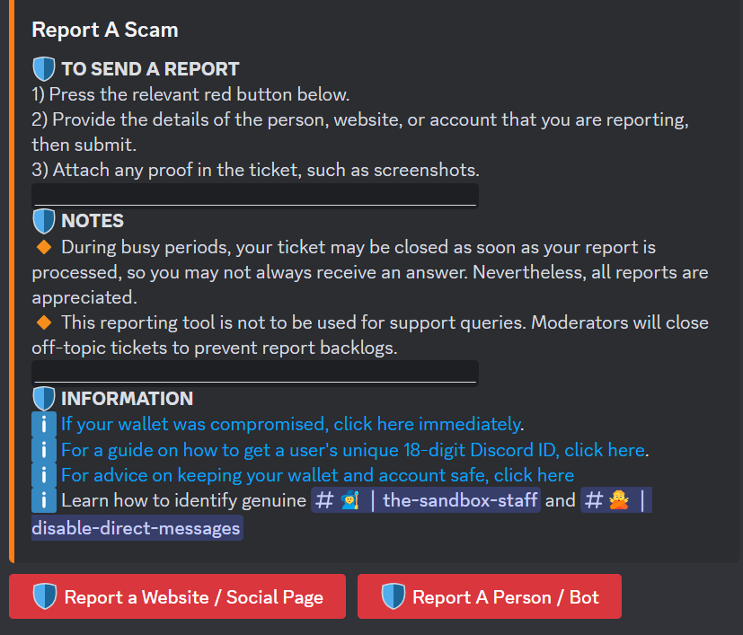 The Discord Community - besides offering a place to communicate with others, share your content, reach out to the team, and seek support - also provides a place to safely and privately report scams and scammers to The Sandbox.
