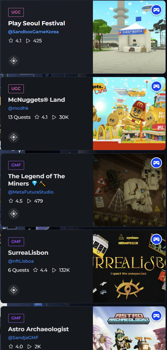 Players can use the following play filters to find exactly what they're looking for, including Experiences launched to Premium LANDs, which are located near partners and larger projects and may include similar themes and assets.
