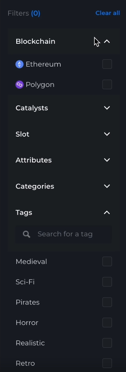 Filter on the left by Blockchain, Catalyst (Rarity), Slot, Attributes, Categories, or Tags (including custom tags added by asset creators).