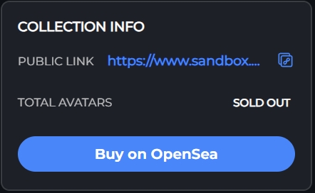The Collection Info box in the top right includes the Public Link for full details about the collection, minting status, and a button to mint an Avatar if it's not sold out or view the collection on OpenSea to purchase one if it is.