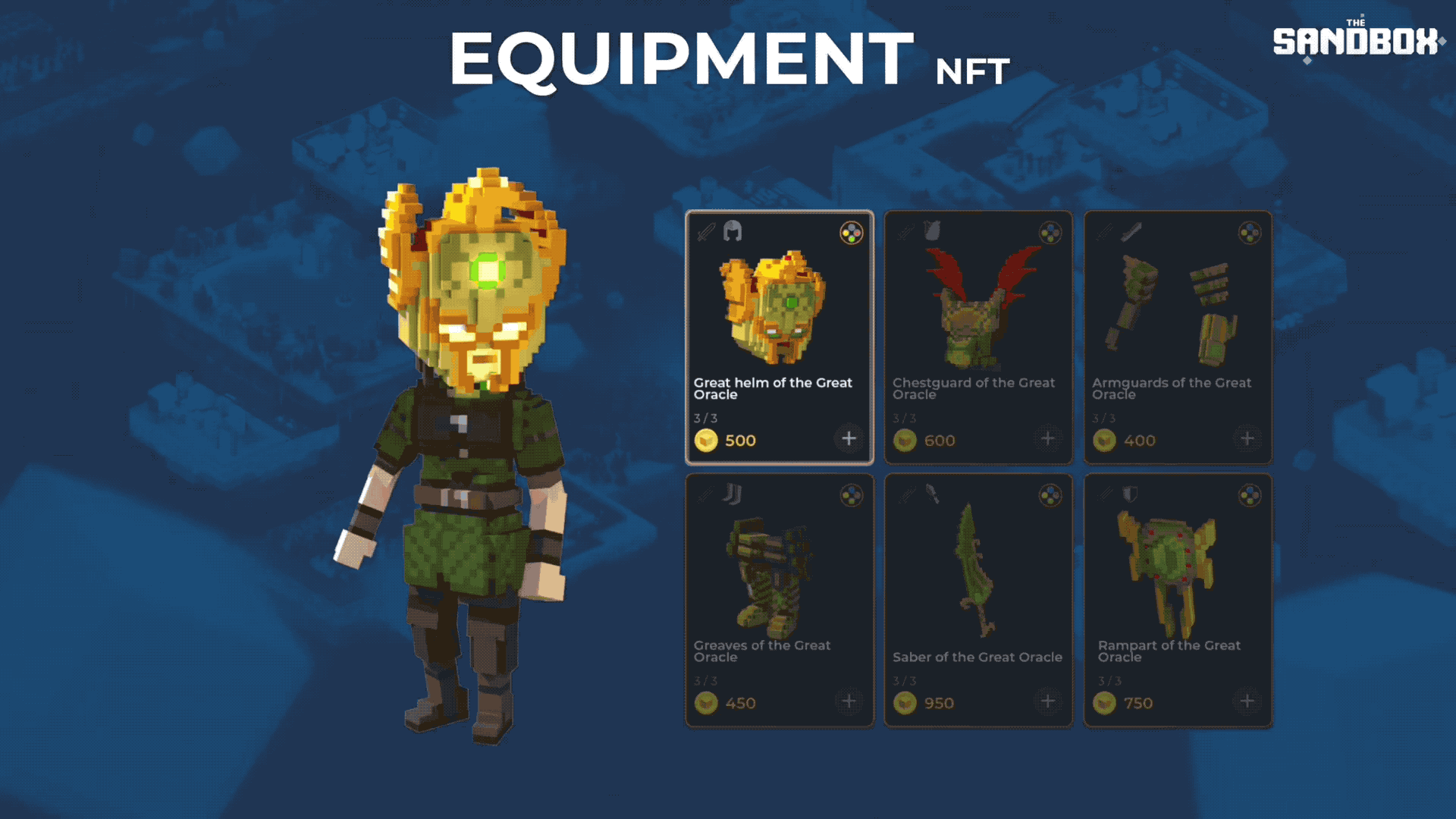 Equipment - These are NFTs that can be placed in the player's inventory. They can be equipped in order to help the player complete game objectives. For example, a sword, a shield a helmet, a pair of gloves and so on. They can be infused with a Catalyst and Gems to modify gameplay, or they can be cosmetic to modify the appearanc of player Avatars. For example, a t-shirt made for members of a community, a pair of bunny ears, wings, and so on.