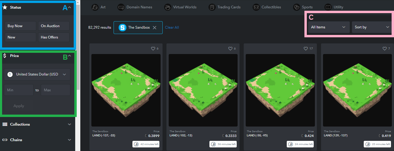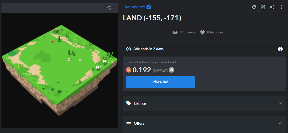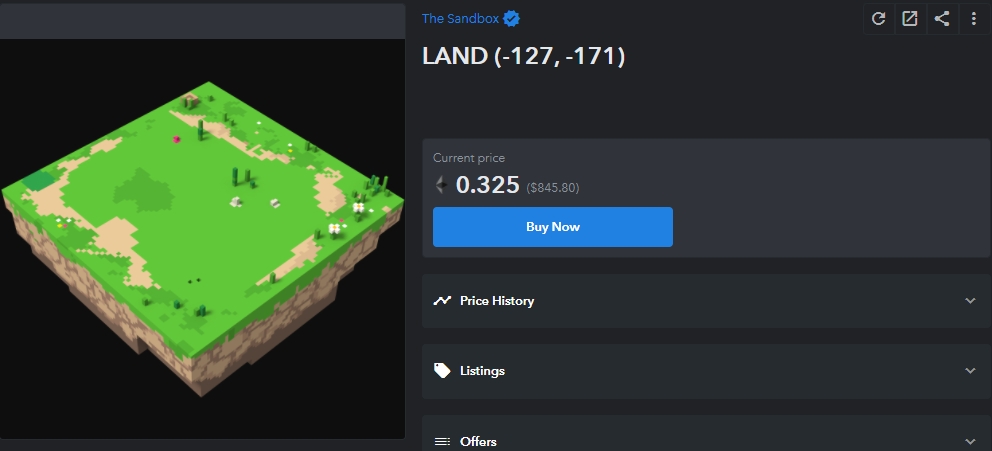 There are three ways you can purchase LAND from OpenSea. These are through auctions, buying them right away or placing an offer on them.