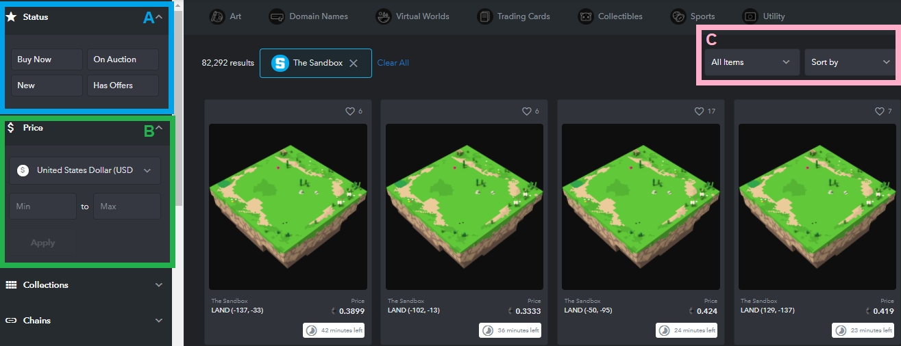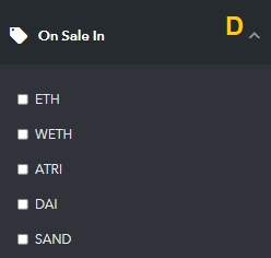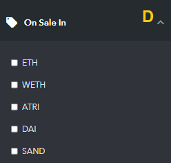 For example, you can: A) Set the listing type that you want. For example - choose items that you can buy now or bid for in an auction. Highlighted in blue in the image above. B) Set the minimum and maximum price that you are willing to pay, in USD or ETH. Highlighted in green in the image above. C) Set whether you want to see all items, single items, or bundled items. And sort by price, newest, oldest and so forth. Highlighted in pink in the image above. D) You can also choose to see listings only in certain currencies (you will need to scroll down the filter list on the left to see this option). Shown in the image below.