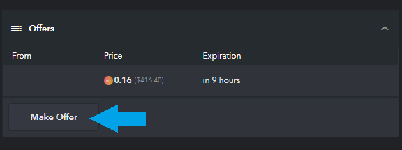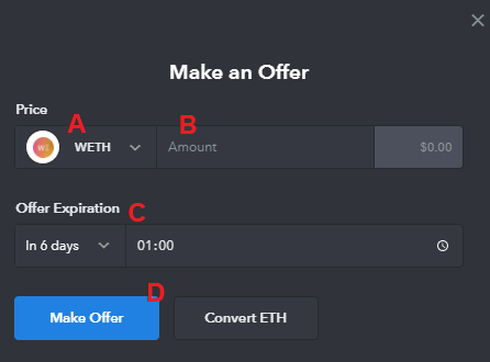 A prompt will appear asking you to: A) Select the currency you wish to make the offer in. B) Enter the amount that you wish to offer. C) Choose when you want the offer to expire (this is the deadline for the owner to accept the offer). D) When ready, press the Make Offer button.