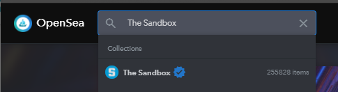Go to the OpenSea.io website. Type The Sandbox into the search box at the top of the website. Click the result in the list. Ensure that the result you click has the blue "verified" checkmark next to it, as shown in the image below.