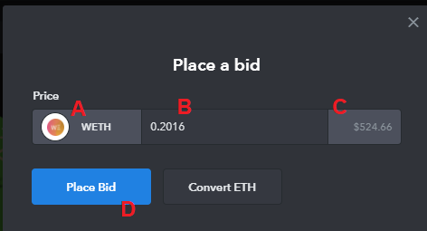 A) Select the currency that you wish to bid in by clicking the part of the window labelled A in the image above. B) Enter the price you wish to bid in the box labelled B in the image above. C) You can see the current USD value of your chosen bid on the right. D) Once ready, click the Place Bid button.